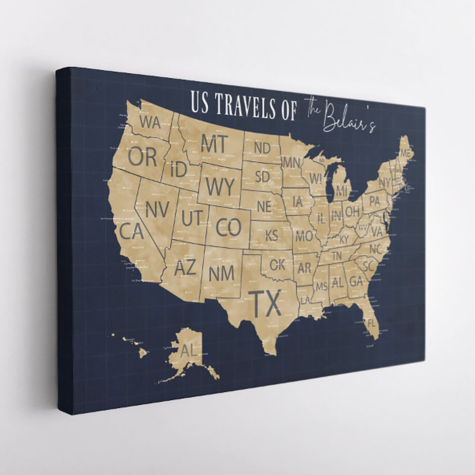 Rustic Push Pin USA Map Personalized Canvas, Travel Gift, United